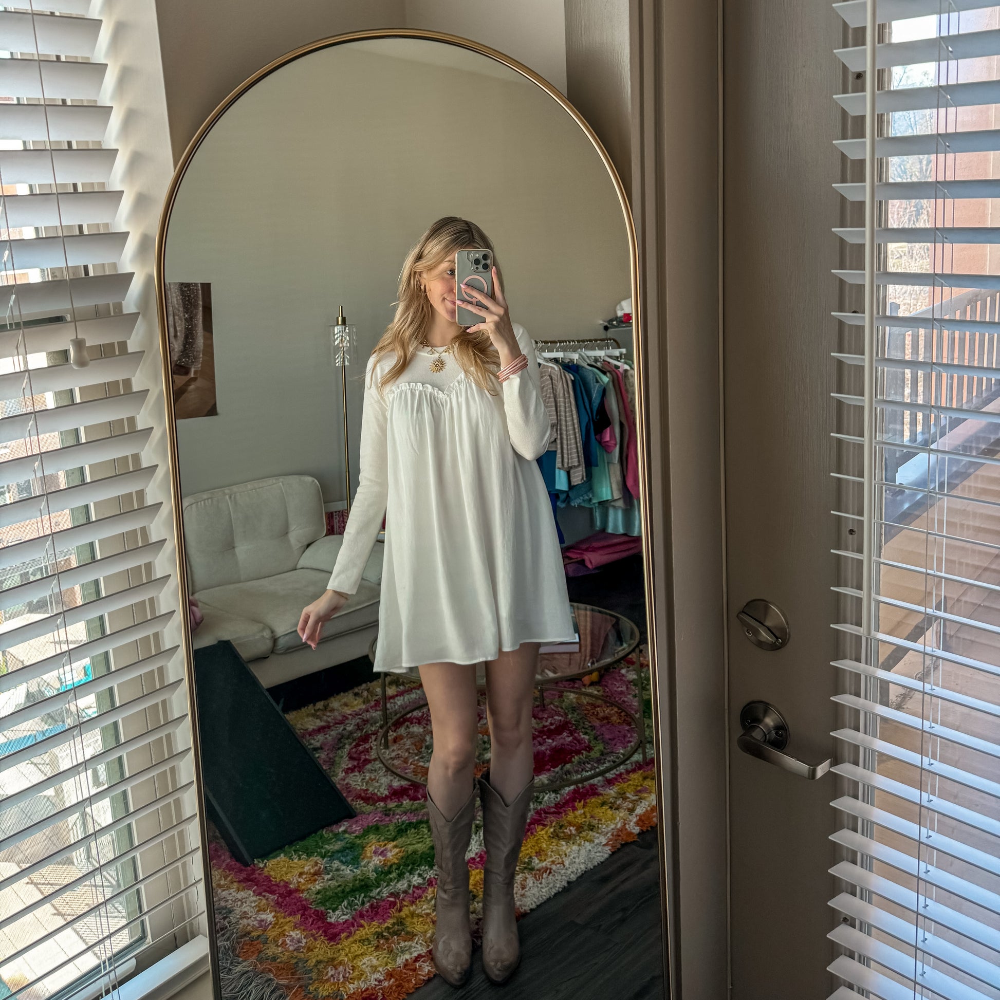 Introducing the Alice Babydoll Long Sleeve Mini Dress - your go-to choice for a flowy and stylish look this spring! With its long sweater sleeves and round neckline, this mini dress offers both comfort and elegance. Perfect for any occasion, this white dress will surely elevate your wardrobe.