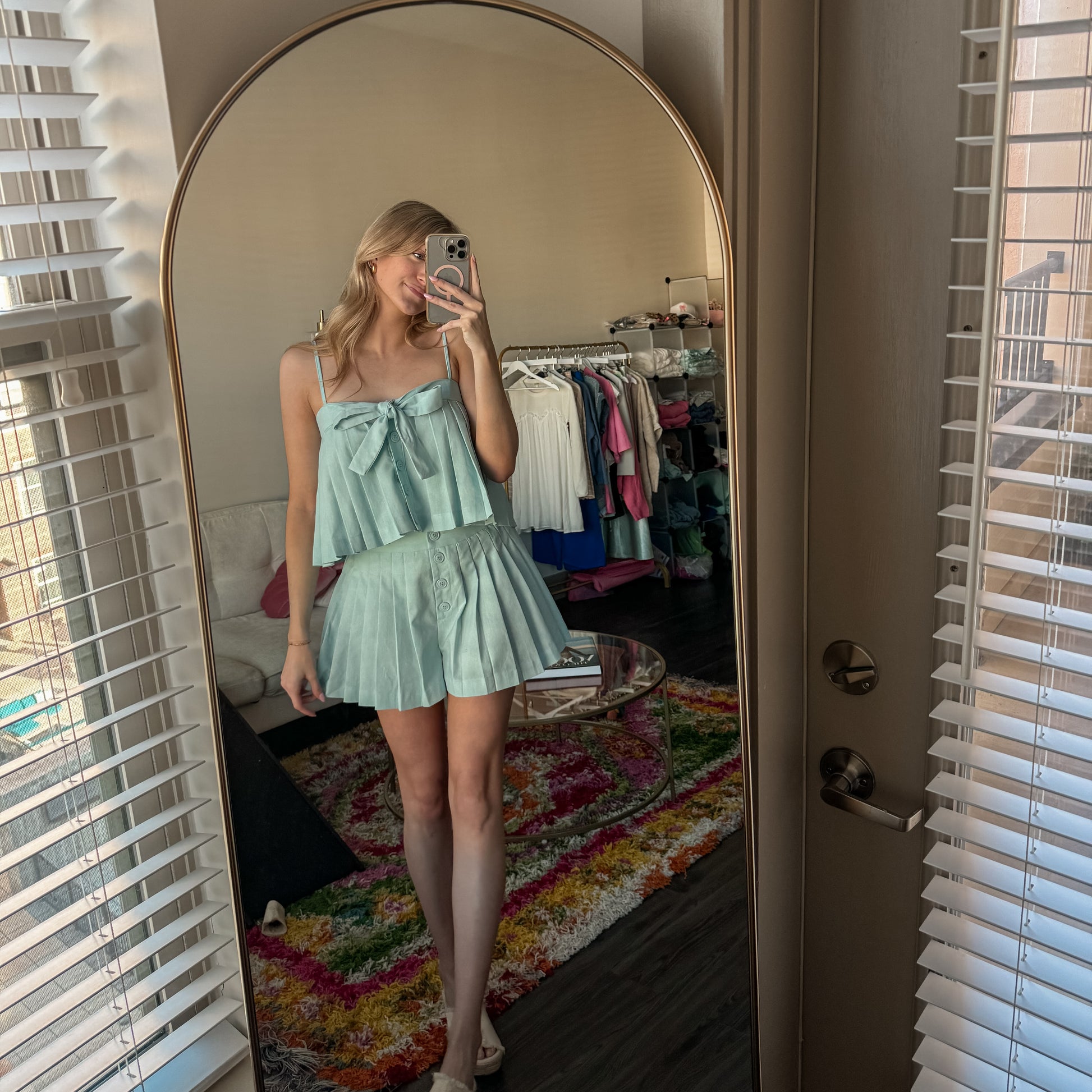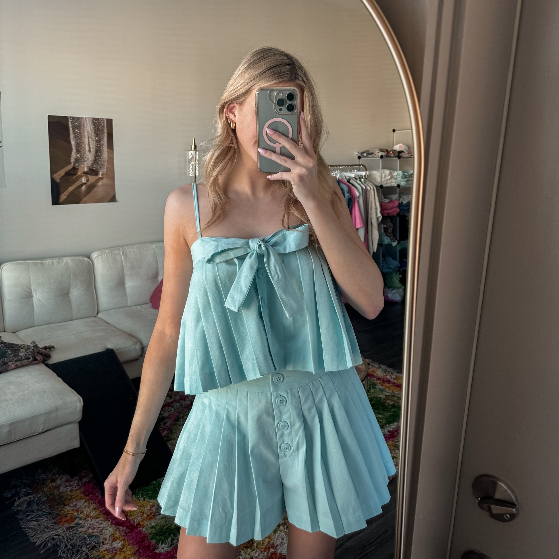 Get ready to feel all the spring and summer vibes with our Happy Place Matching Set! This set features a pleated front bow top and button-down shorts in a sky blue color, perfect for any occasion. A must have for your spring and summer wardrobe!