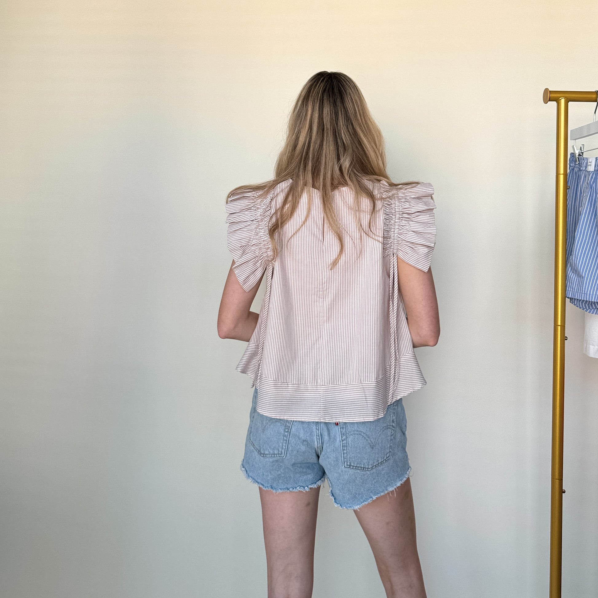 Introducing the Ellie Top - a taupe and white striped delight. The flirty fluttery sleeves, complete with a cute tie, make this top a must-have for any occasion. Upgrade your wardrobe with this adorable top!