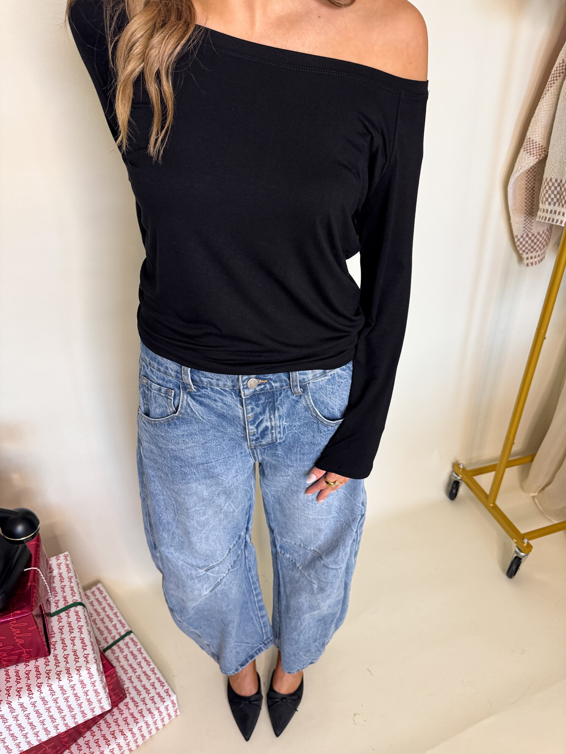 Looking for a versatile top that's effortlessly stylish? Look no further than our Everyday Off The Shoulder! Soft, black fabric with ruched sides can be dressed up or down, making it perfect for any occasion. A must-have addition to your wardrobe.