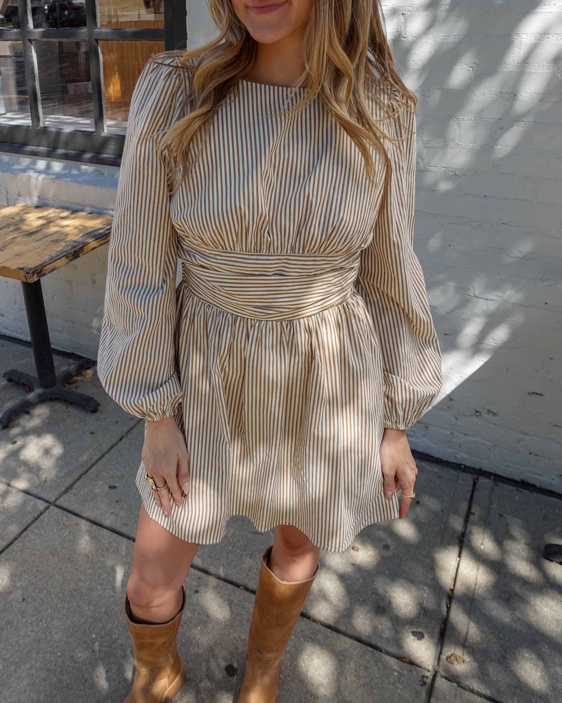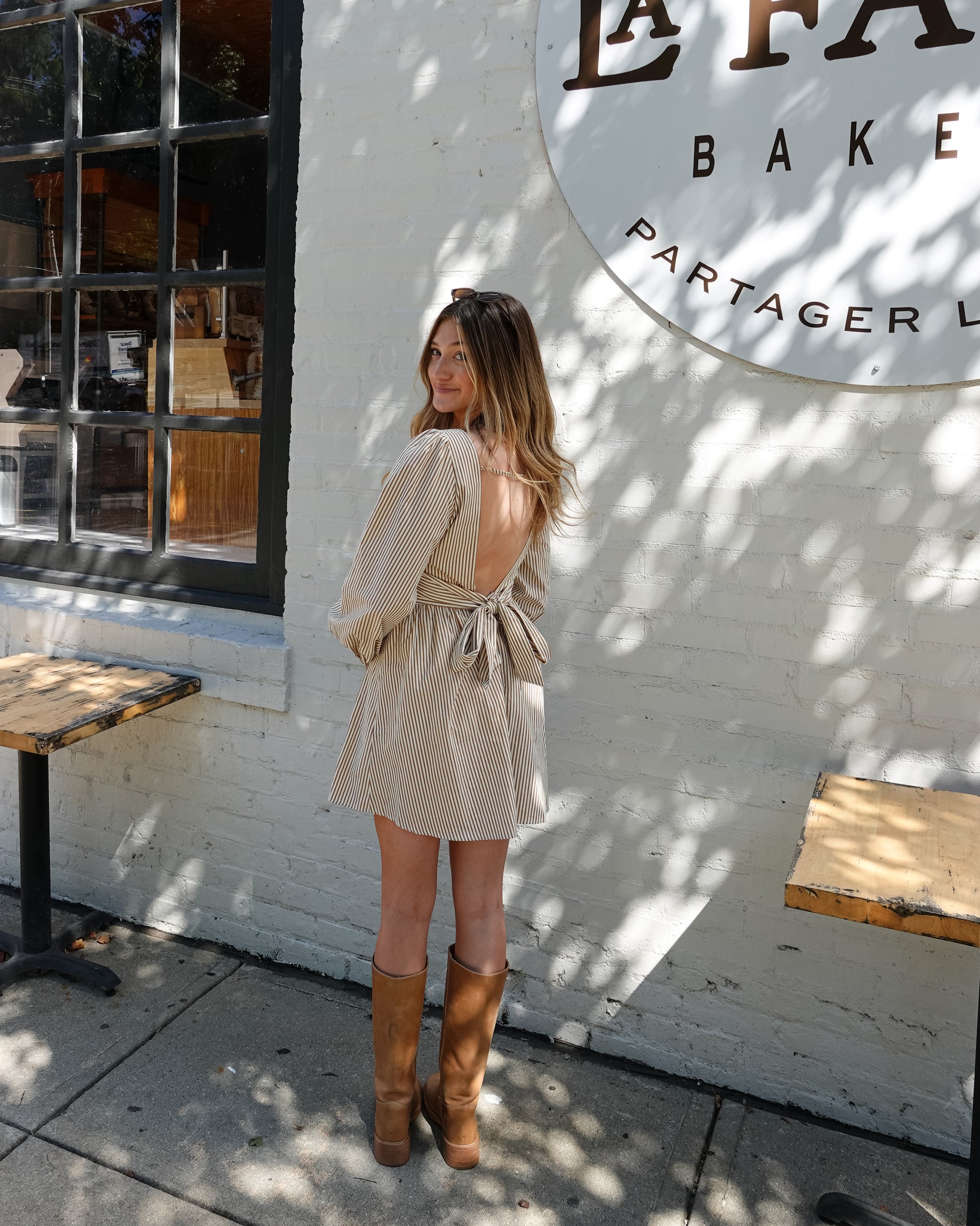 The Falling For You Mini Dress features playful mocha and white stripes, an open back, and a charming bow that adds a flirty finish. This lightweight dress is perfect for those who want to blend comfort with a touch of girly style.