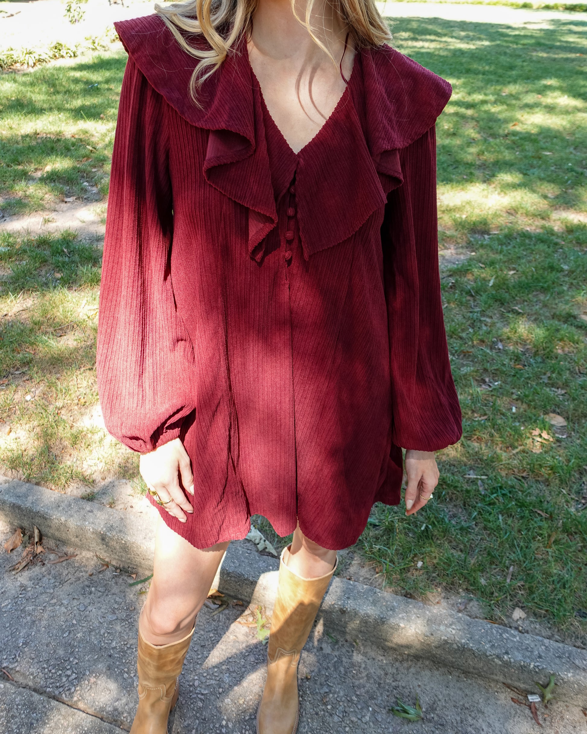 The Fine Wine Dress brings playful charm with its rich burgundy corduroy fabric, flirty ruffle collar, and adorable button details.