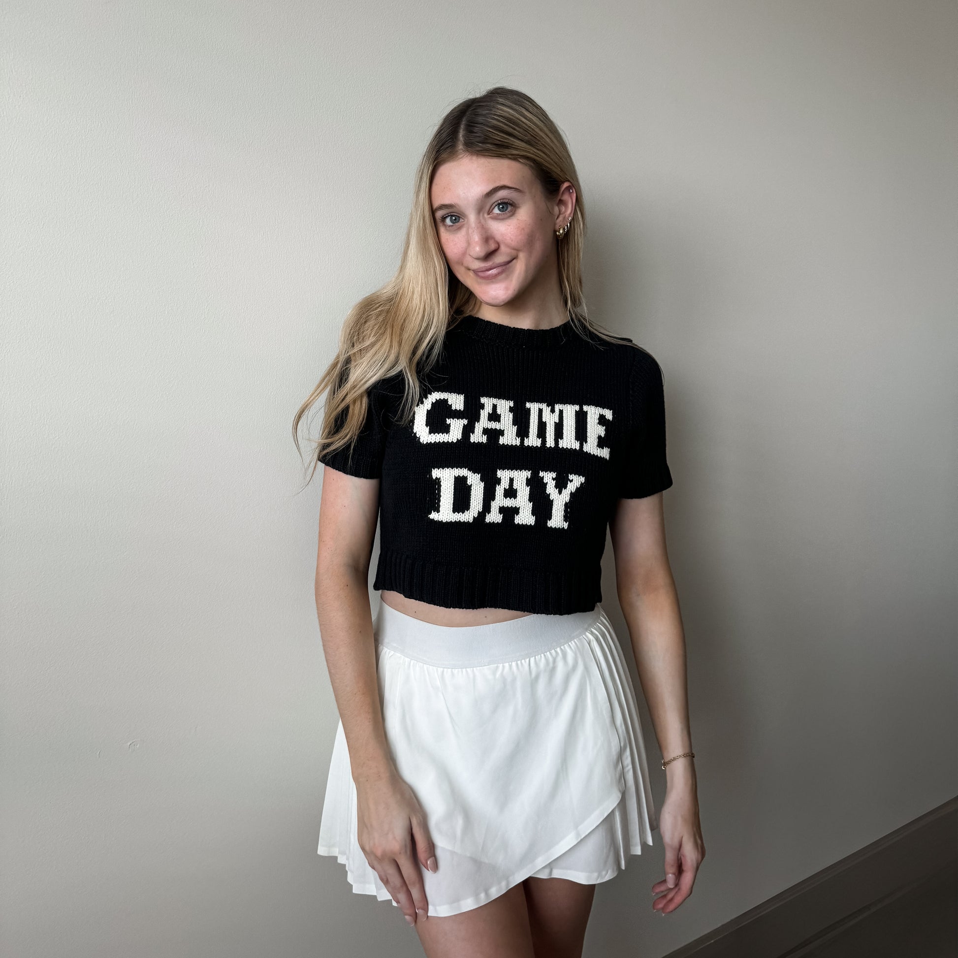 Get ready for game day with this knit top! Featuring a black and white design, this crop sweater is perfect for watching the game at your favorite bar or creating a stylish game day outfit for football season. Dress it up or keep it casual - the choice is yours!