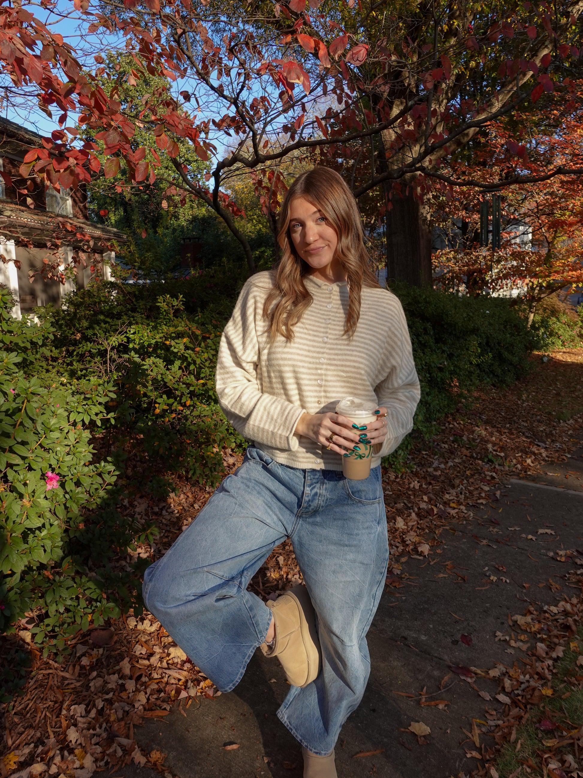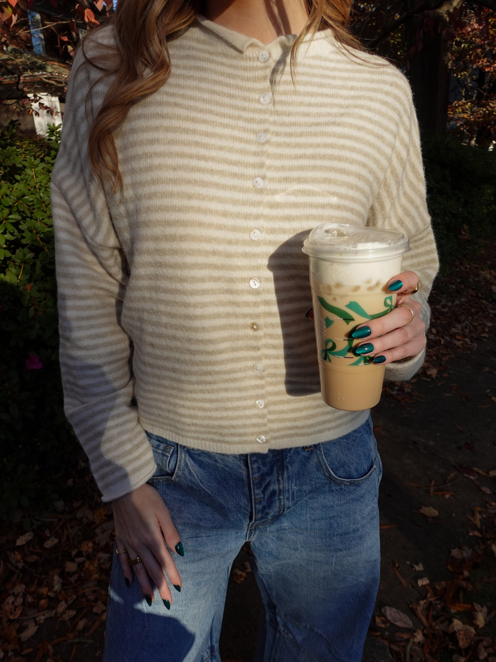 Bringing back a best seller, in a new color! The Maisie Cardigan in a beautiful striped cream colorway! Lightweight and soft, this cardigan is perfect for any occasion. Button it up for a more put-together look or leave it open for a relaxed vibe. Versatile and stylish, the Maisie Cardigan is a must-have for any wardrobe.