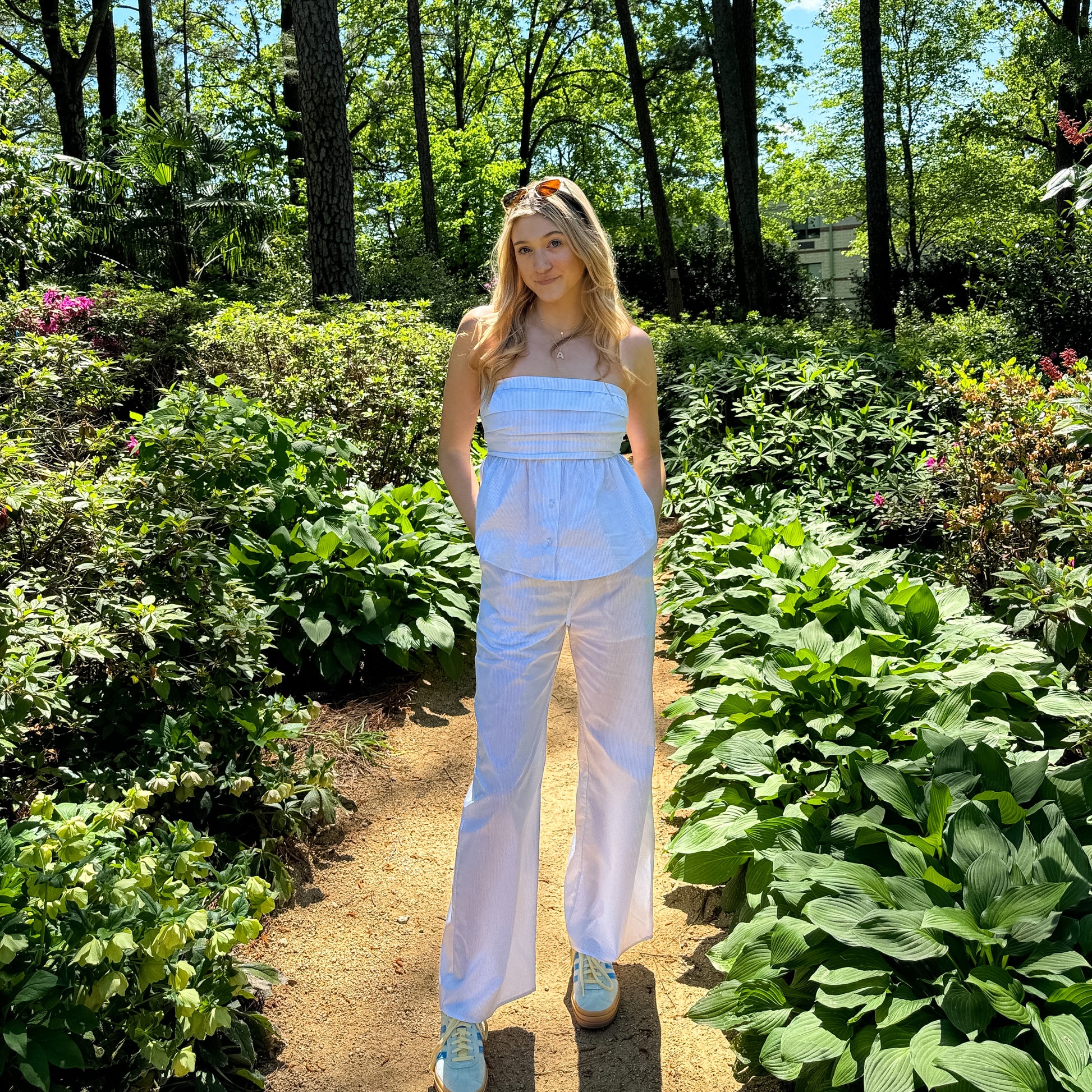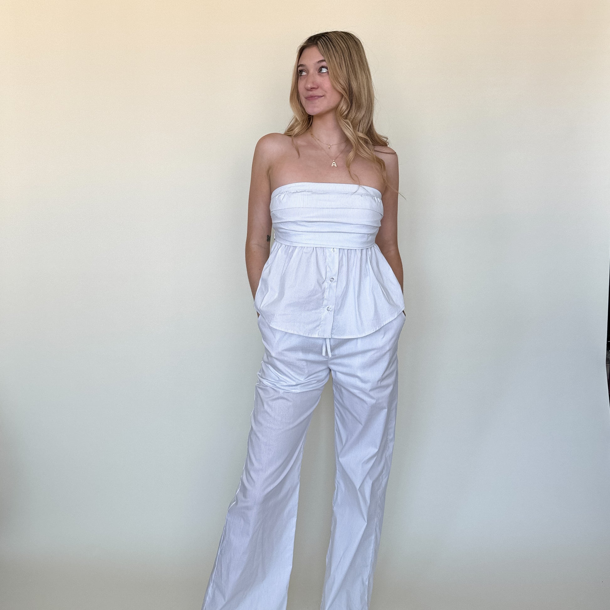 Introducing our Matilda Matching Set, a playful and versatile addition to your wardrobe! The tube top features delicate blue pinstripes and charming button detailing, while the matching drawstring pants offer the perfect fit. The top has a side zipper, but is stretchy throughout. Combine them for a fun and trendy look or mix and match for endless outfit options.