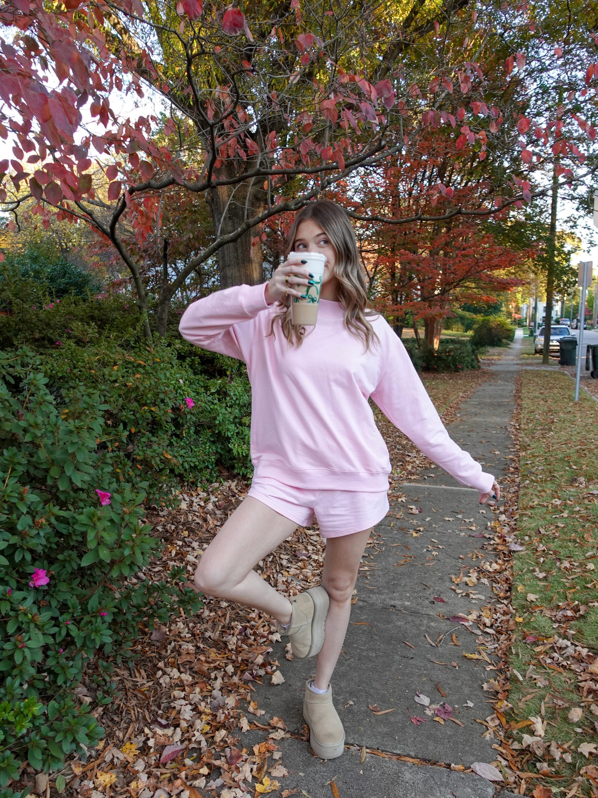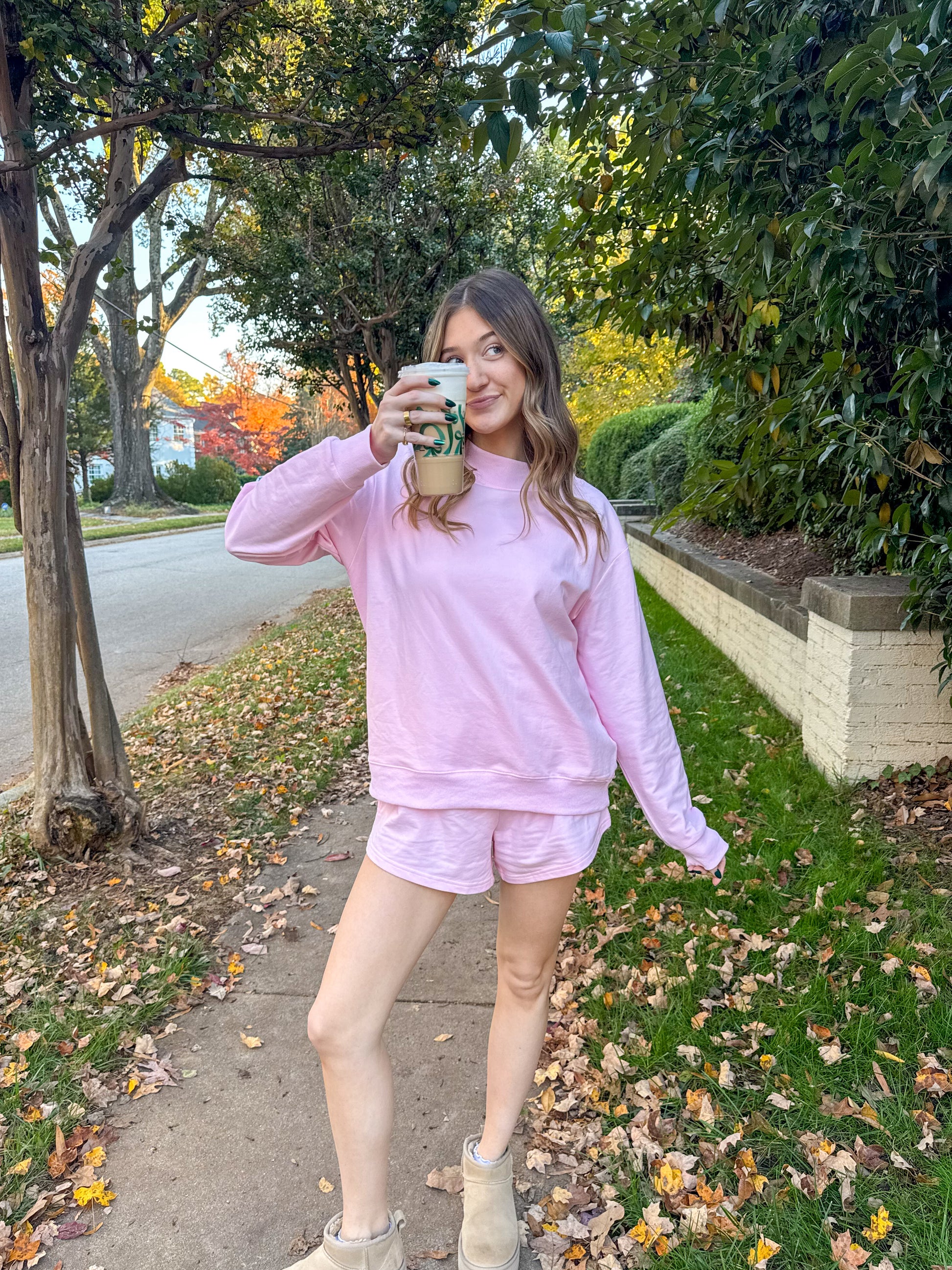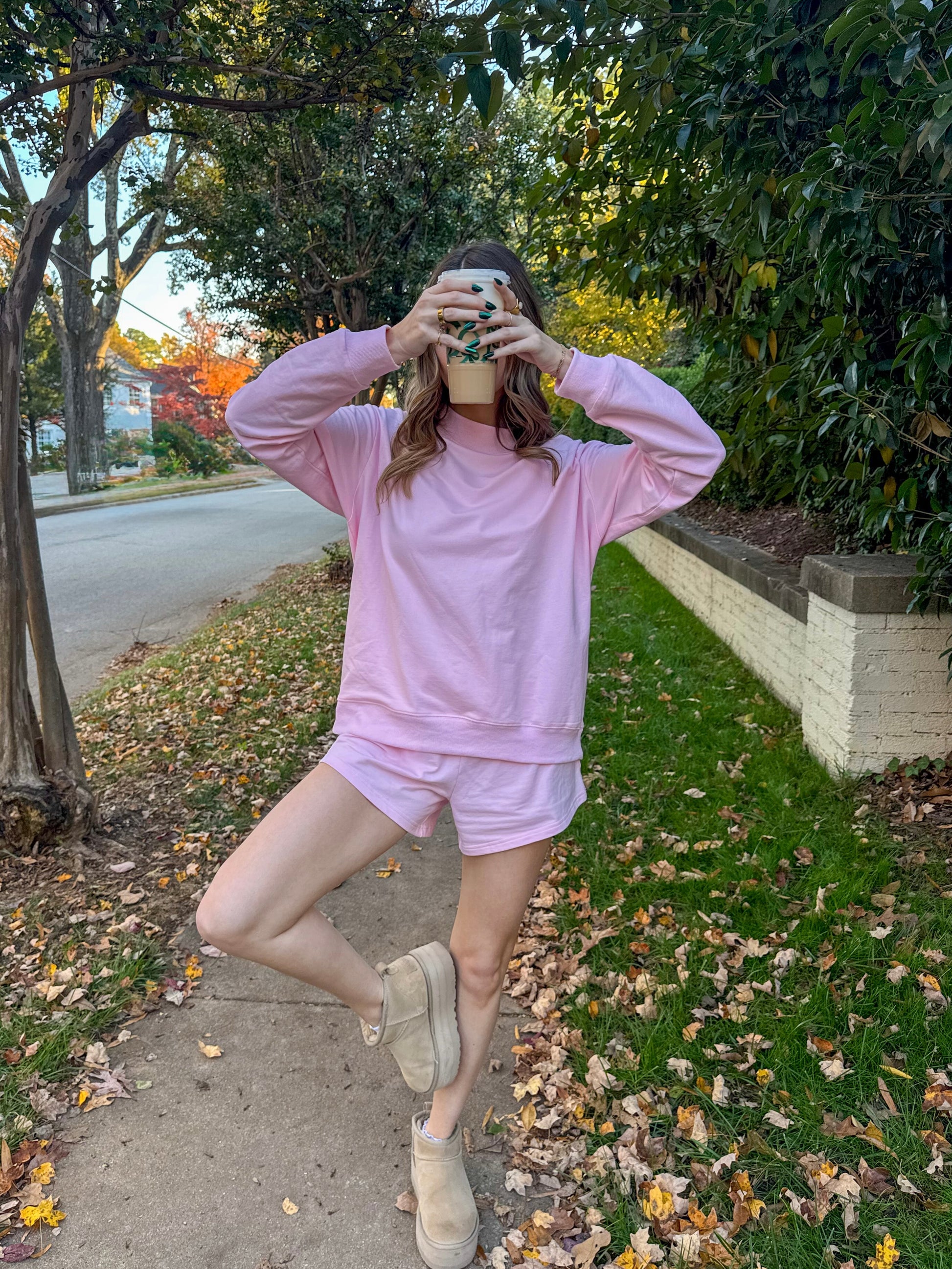 Get ready for a cozy morning in our Morning Stroll Set. Made with soft terry fabric, the mock neck sweatshirt features an oversized neck band for added comfort, while the knit sweat shorts offer a relaxed fit and elastic waistband for ease of movement.