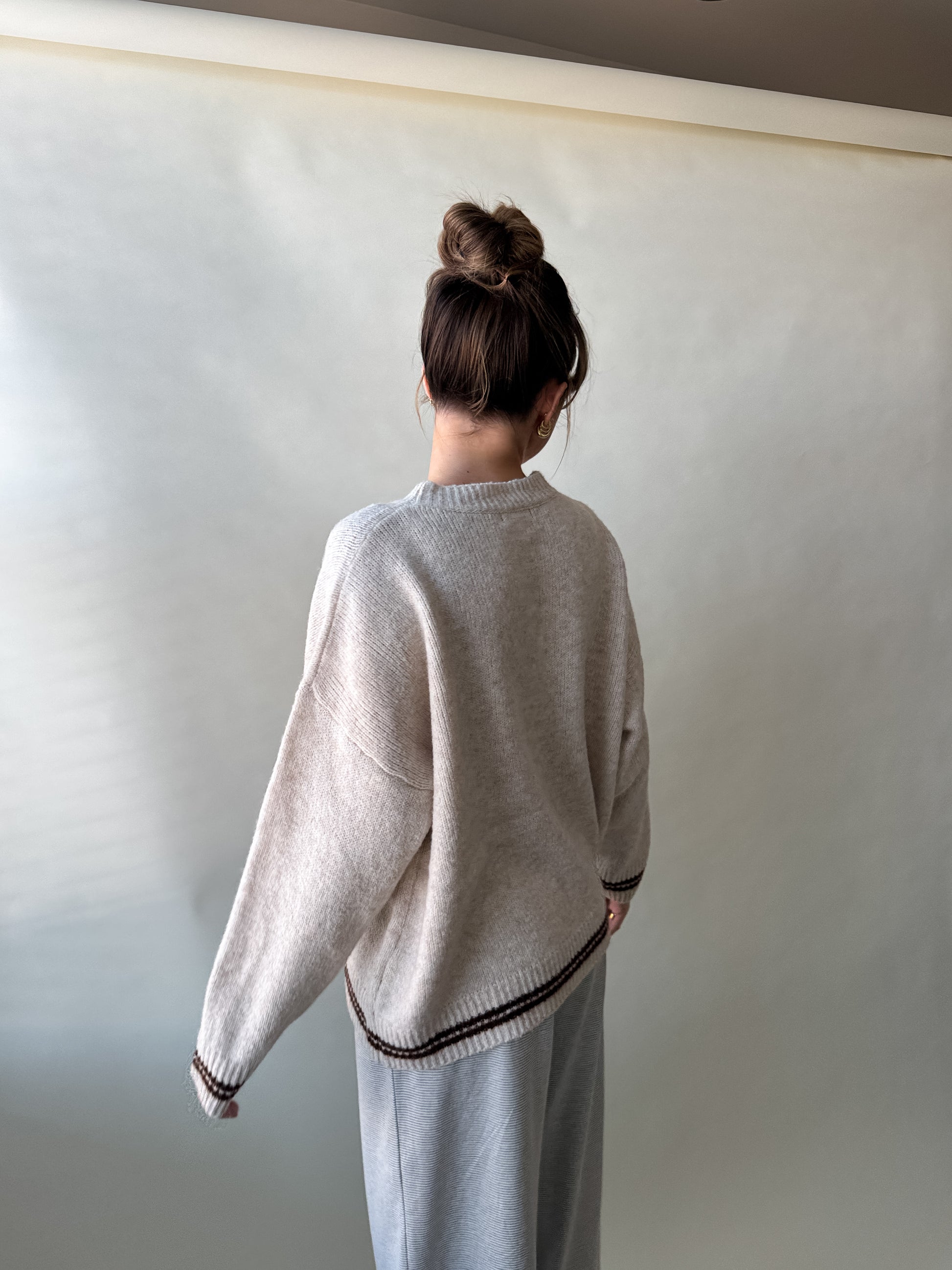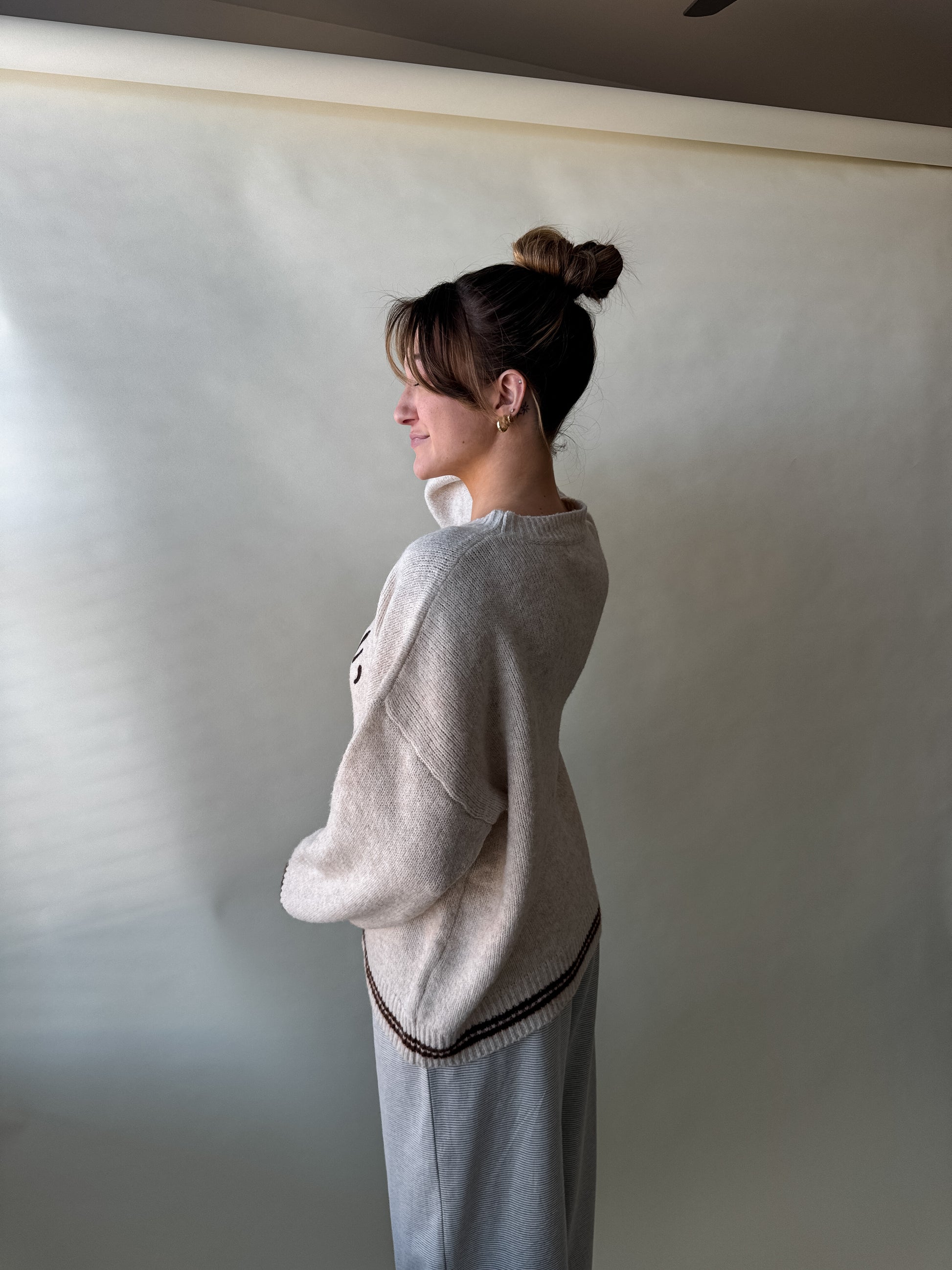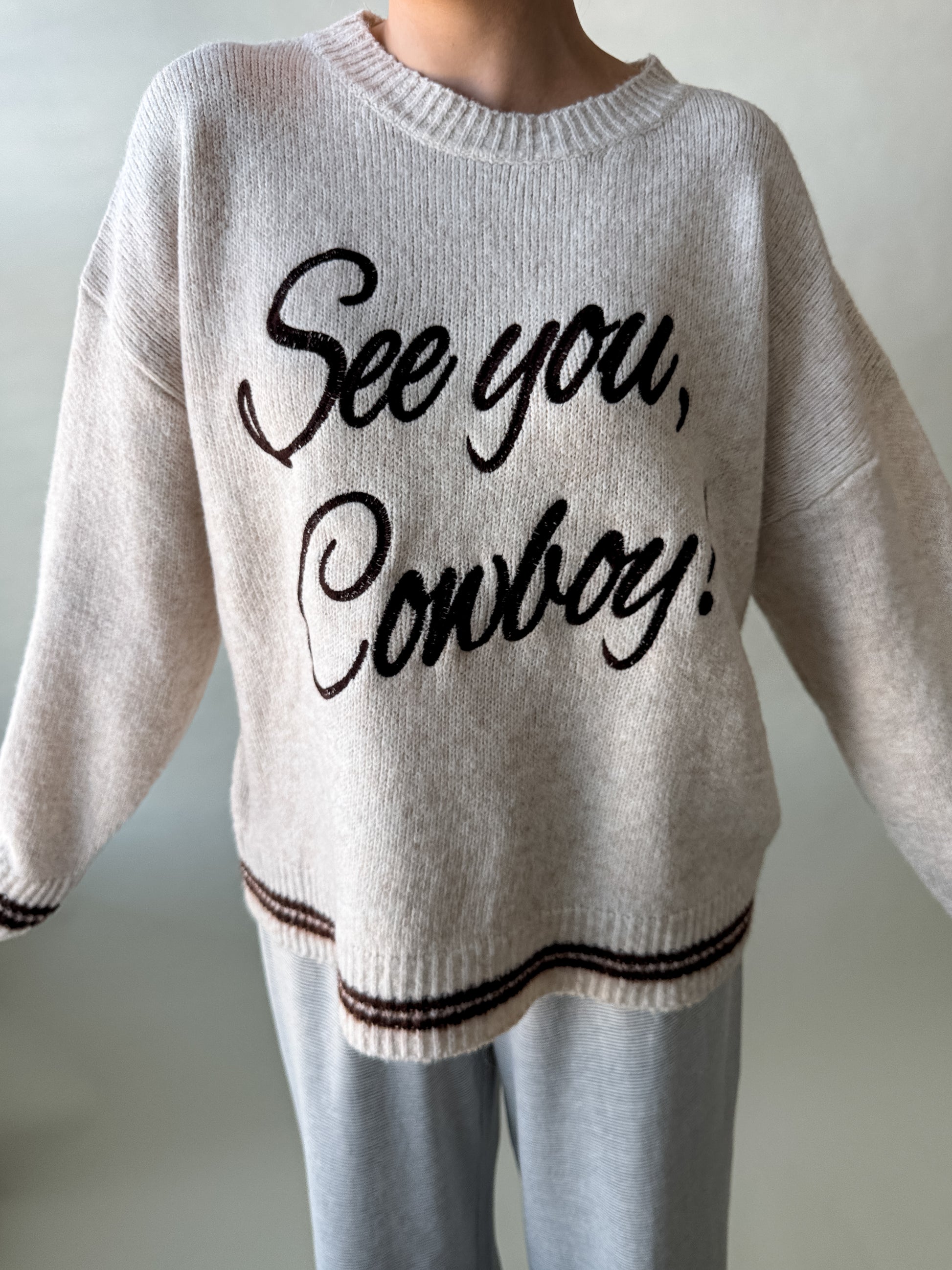Cozy up in this oversized oatmeal sweater featuring warm chocolate brown accents and a playful "see you, cowboy!" message across the front. Perfect for laid-back days, this comfortable knit pairs effortlessly with your favorite jeans or leggings.
