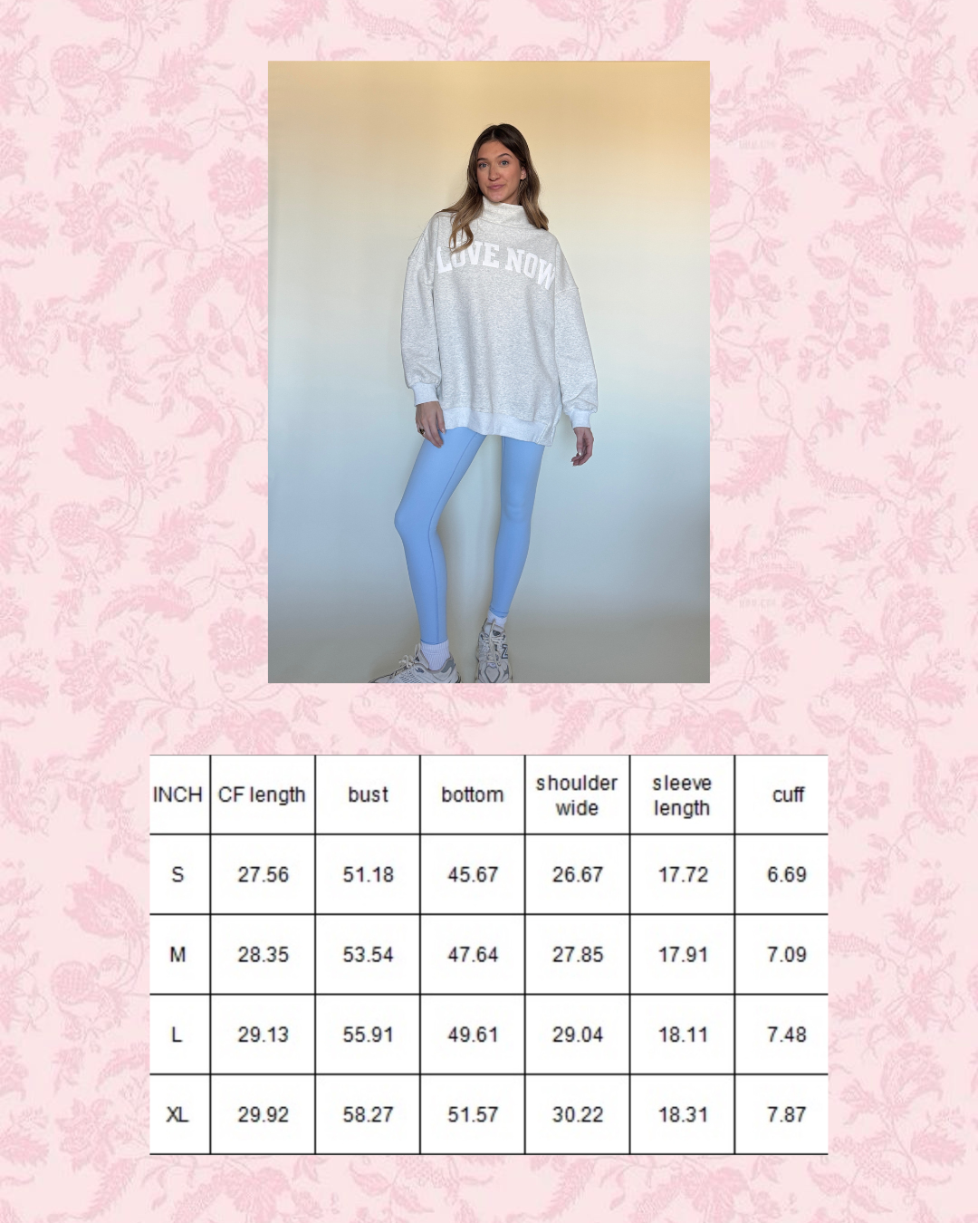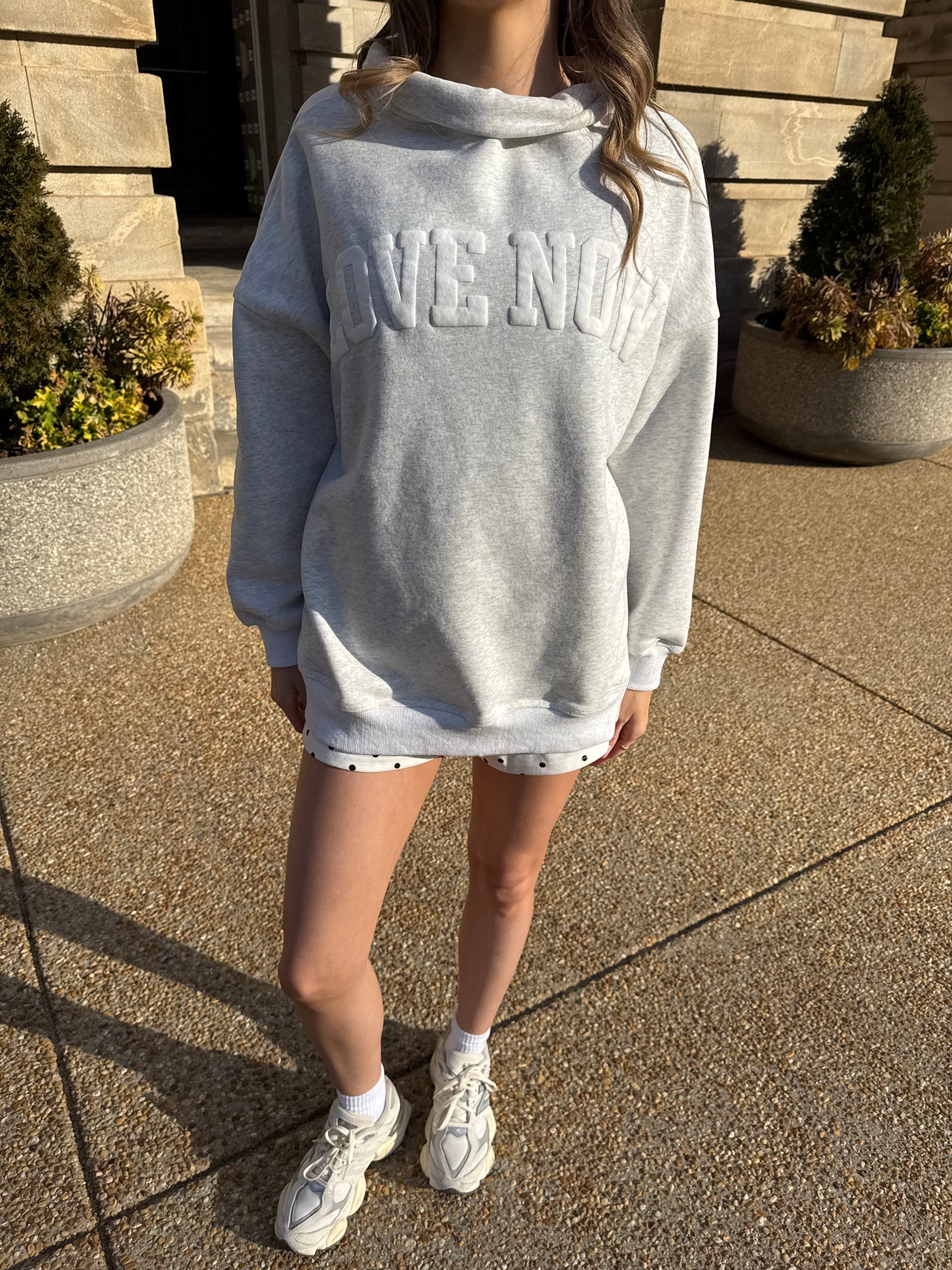 Introducing The Love Now Mockneck, your new favorite sweatshirt. It has the perfectly oversized fit, and a versatile neckline that can be tucked in, rolled over, or worn up. Once you wear it, you won’t want to take it off!