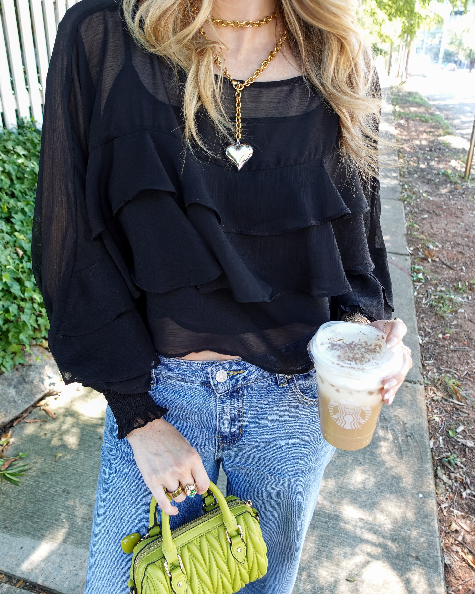 The Timeless Ruffle Top brings a playful vibe with its sheer, flowy fabric and charming ruffles along the front. Complete with it's sheer tank top underneath, it’s perfect for stepping into fall weather and adds a elevated look to your everyday style.
