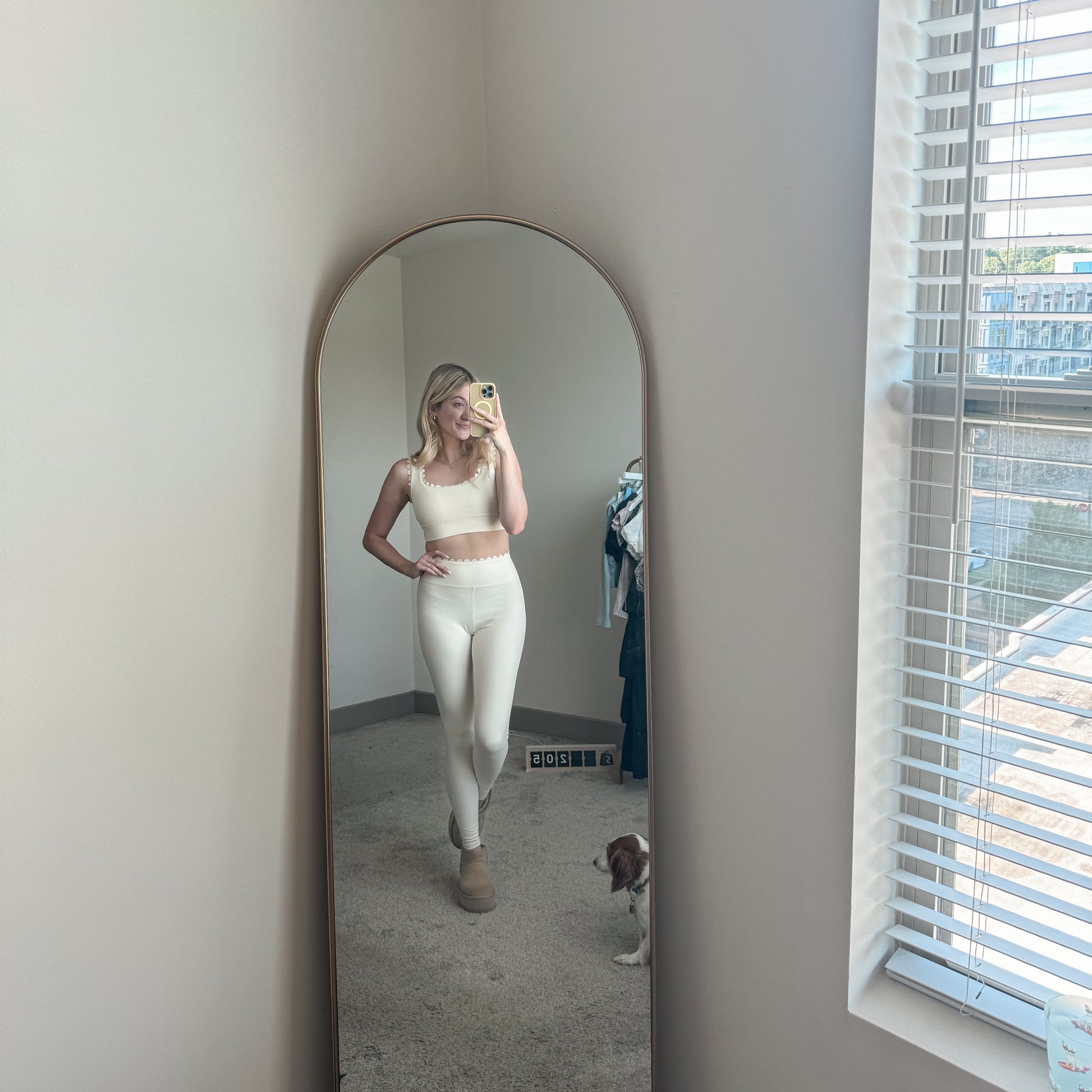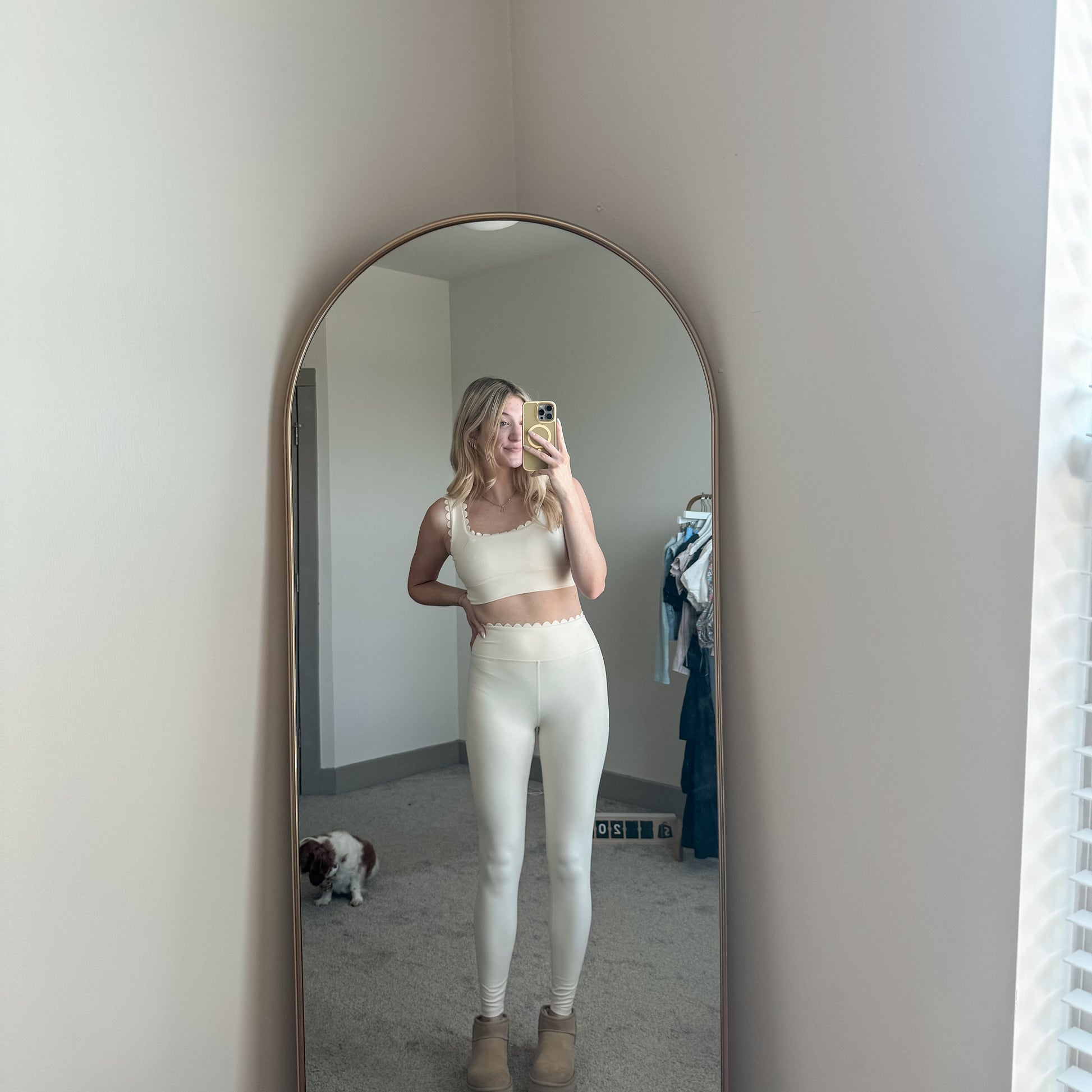 Introducing the sweetness of our Vanilla Latte Matching Set. This adorable scallop edge set features a v-back bra top with removable padding and full length leggings. Perfect for a stylish and comfortable workout, or a cozy day at home.