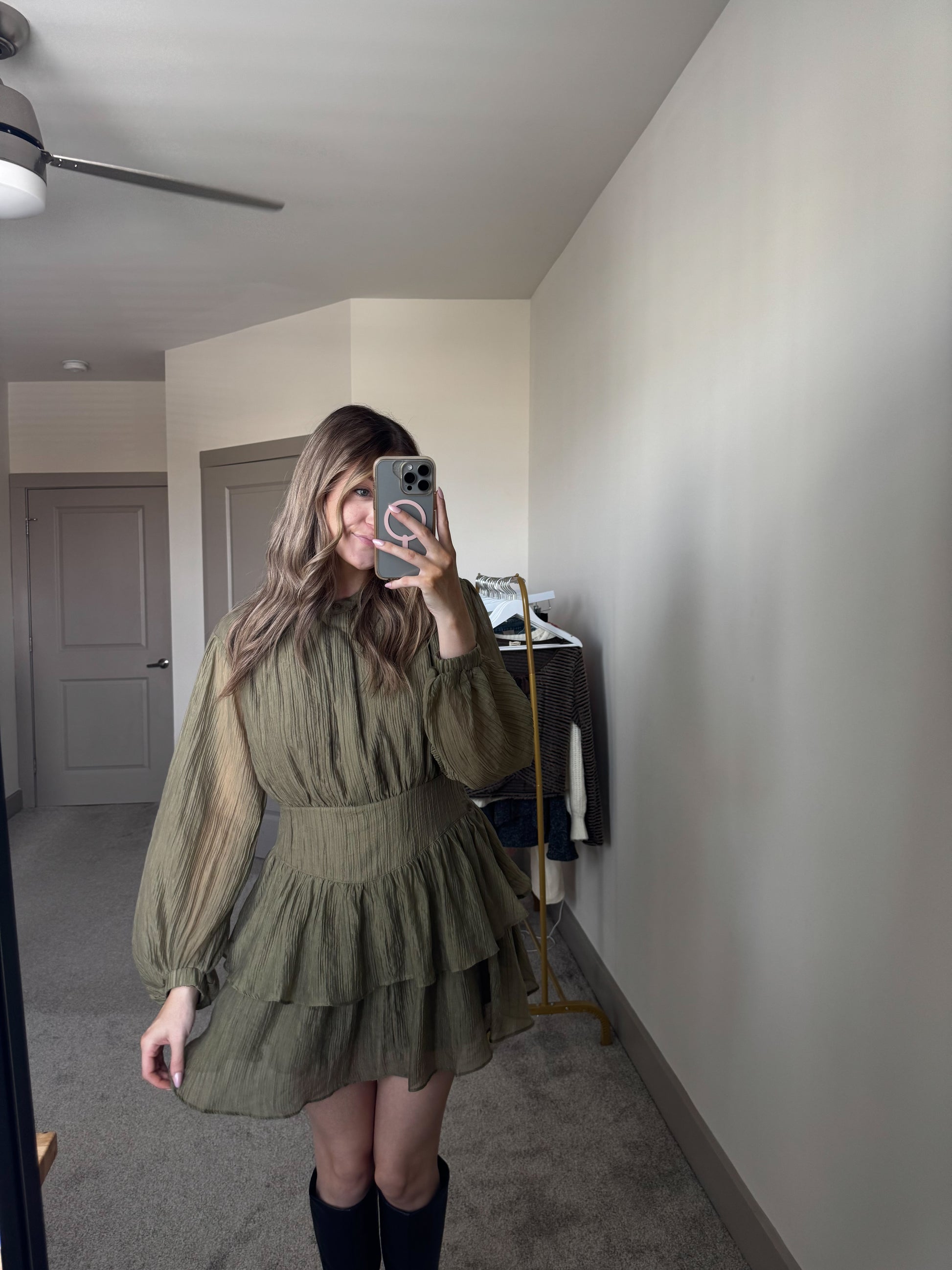 Get ready for the holidays with this olive green tiered dress! Perfect for Thanksgiving or Christmas, this dress features long sheer sleeves and a sheer upper back.